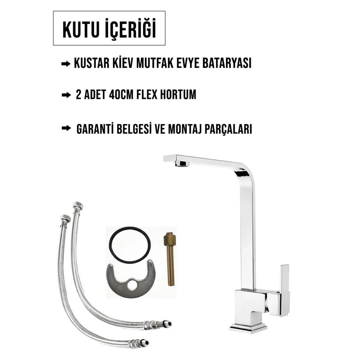 - 50 cm flex bağlantı hortumları somun vidası ay ve contası ile beraber montaja hazır bir şekilde tarafınıza gönderiyoruz.